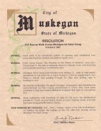 MAINTENANT IL EST RÉSOLU, que moi, Fred J. Nielson, Maire de la ville de Muskegon, par la présente reconnaît les marcheurs des 221 milles S.O.S journée Falun Gong pour le Michigan.