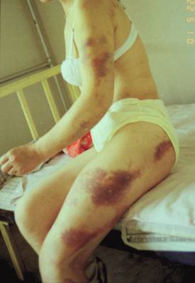 perdu deux de mes dents incisives. J'avais de nombreuses blessures sur la tête. Tout mon corps est devenu tout noir et enflé d'ecchymoses bleues. On aurait dit que mes os s'étaient fracassés en morceaux. Ensuite, il a donné libre cours à sa nature de brute . Il m’a frappé férocement, avec son bâton sur l’ oreille droite et sur la tempe. J’ai perdu conscience. Après que j'aie eu perdu conscience, il m’a traînée sous le pont et a arraché mes pantalons. Il m’a violé. Après cela, il a enfoncé son bâton en caoutchouc dans mon vagin poussant de toutes ses forces, et ensuite il s’est assis sur moi. Lorsque j’ai repris conscience, et un peu de force, j’ai crié aussi fort que je pouvais, "Au secours ! Attrapez cette crapule !" Cependant, il n'avait aucun remords, ni crainte. Je lui ai dit, que je le poursuivrais au poste de police de la sous-station, apeuré il a filé sur sa bicyclette.