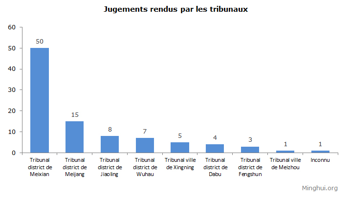 Les 94 peines de prison (16 personnes ayant été condamnées deux fois) ont été prononcées par huit tribunaux de la région : le tribunal du district de Meixian, le tribunal du district de Meijiang, le tribunal du district de Jiaoling, le tribunal du district de Wuhua, le tribunal de la ville de Xingning, le tribunal du district de Dabu, le tribunal du district de Fengshun et le tribunal de la ville de Meizhou.