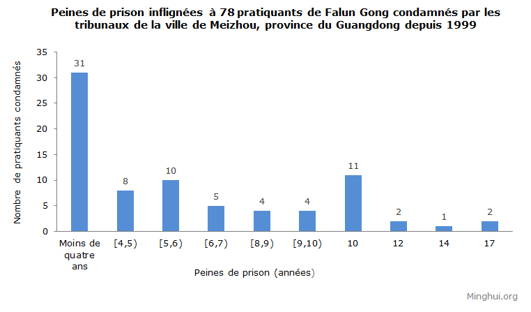 (Minghui.org) Au moins 78 pratiquants de Falun Gong ont été illégalement condamnés à des peines de prison par les tribunaux de la ville de Meizhou, dans la province du Guangdong, depuis le début de la persécution en 1999.