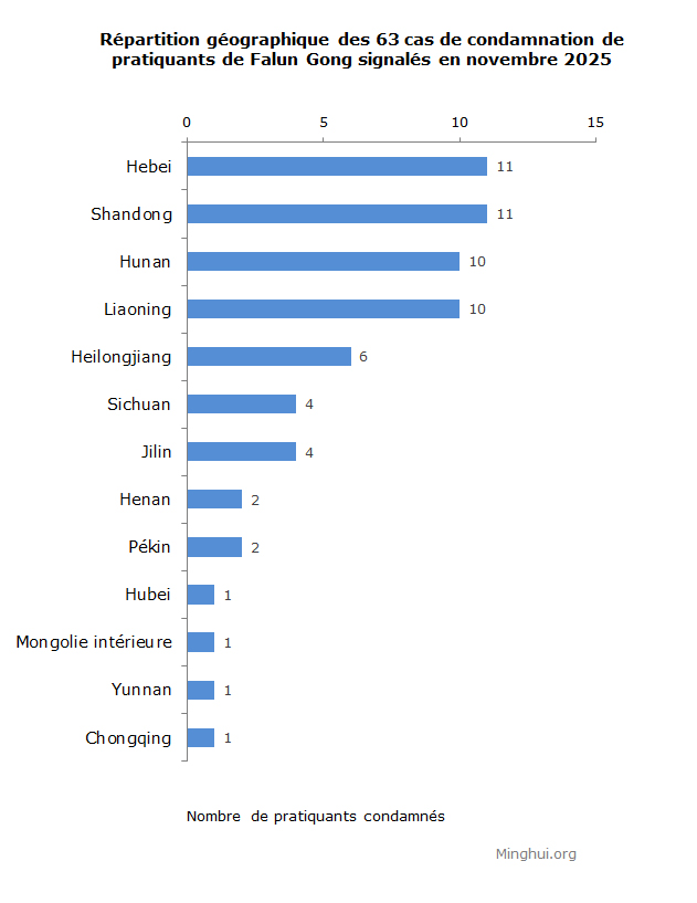 (Minghui.org) Un total de 63 cas de pratiquants de Falun Gong condamnés à des peines de prison pour leur croyance ont été signalés en novembre 2025, dont 57 cas survenus en 2025 et 6 au cours des années précédentes. Le retard dans la communication de ces informations est dû à la censure de l’information en Chine sous le régime communiste, ce qui rend difficile pour les correspondants de Minghui d’obtenir, de vérifier et de transmettre les données en temps opportun.