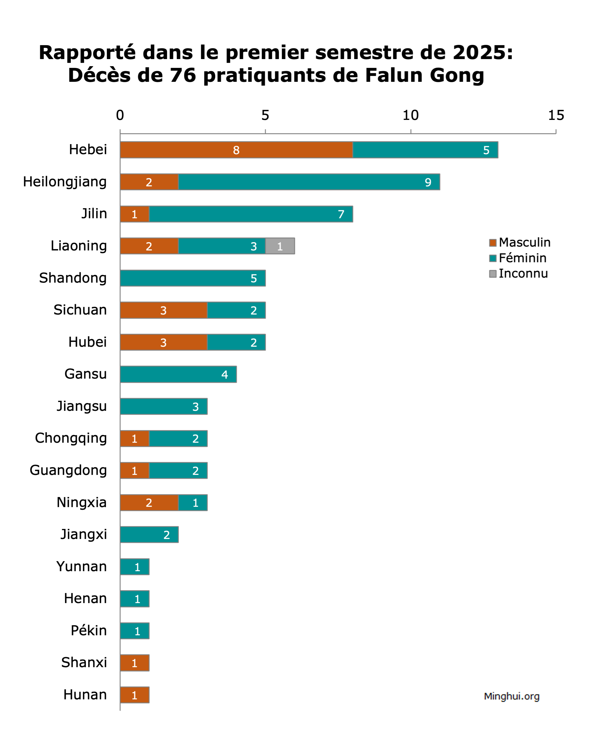 Les 76 pratiquants décédés, dont 50 femmes et un pratiquant dont le sexe n’est pas connu, provenaient de 18 provinces et municipalités. La province du Hebei a enregistré 13 décès, suivie de 11 dans le Heilongjiang, 8 dans le Jilin et 6 dans le Liaoning. Les 14 autres régions ont enregistré entre un et cinq cas.