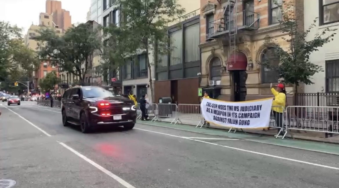 Le président Trump et son entourage ont vu des pratiquants brandir des banderoles à leur sortie du siège de l’ONU. Le président a salué les pratiquants.