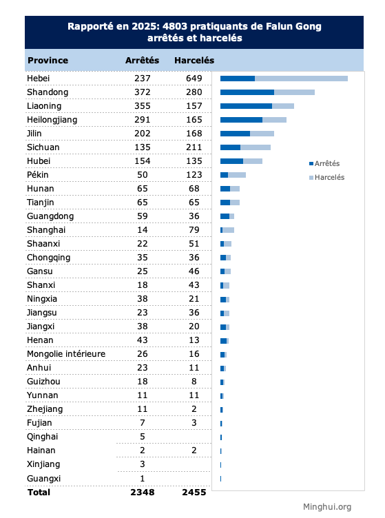 Ce ne sont là que trois exemples parmi les 4803 cas d’arrestation ou de harcèlement de pratiquants de Falun Gong qui ont été nouvellement signalés en 2025. En raison de la censure stricte de l’information imposée par le Parti communiste chinois (PCC), qui empêche souvent les correspondants de Minghui de recueillir et de signaler les persécutions en temps opportun, certains des faits signalés ont en fait eu lieu avant 2025.