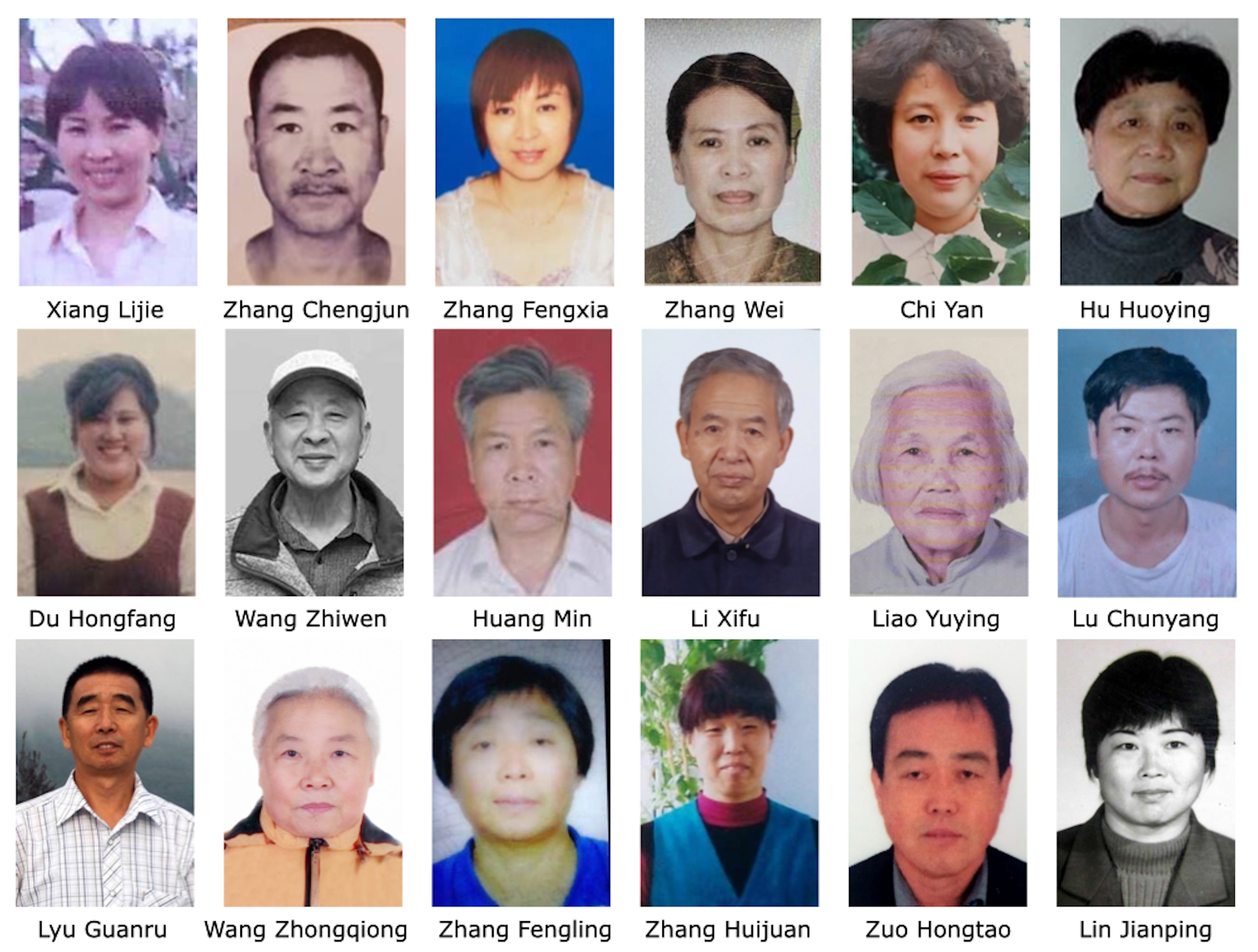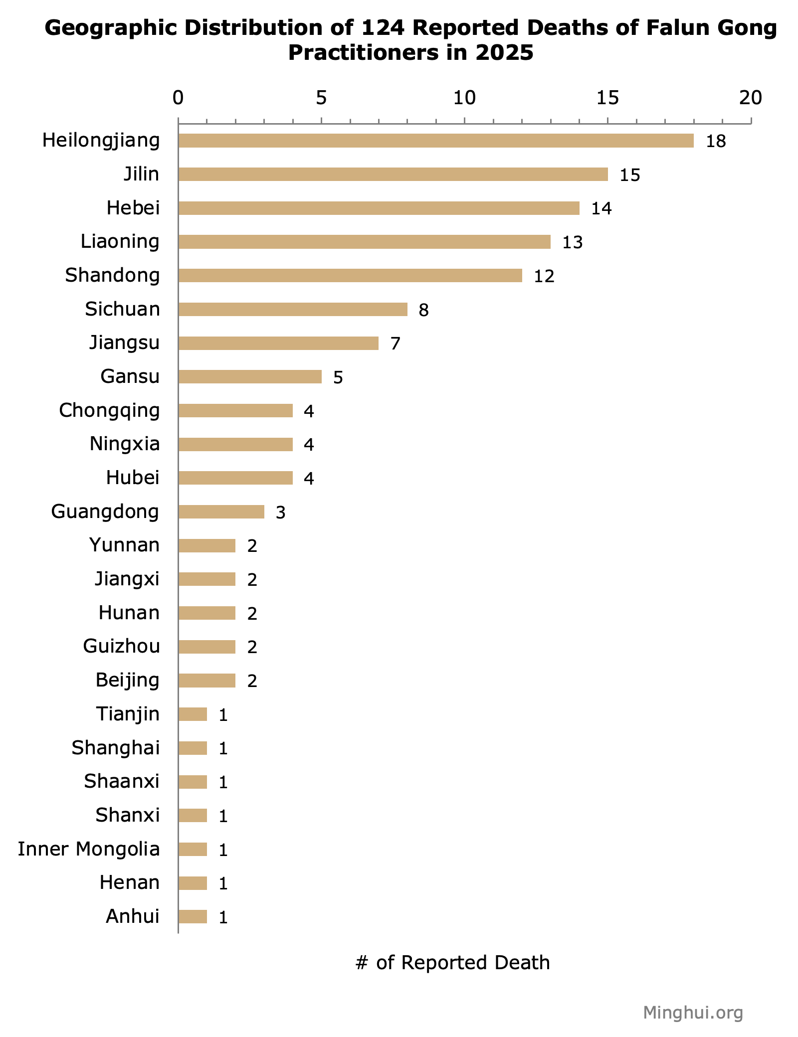 Les 124 pratiquants décédés, dont 85 femmes, provenaient de 24 provinces et municipalités. La province du Heilongjiang a enregistré le plus grand nombre de décès (18), suivie par celles du Jilin (15), du Hebei (14), du Liaoning (13) et du Shandong (11). Les 19 autres régions ont enregistré entre un et huit cas chacune.