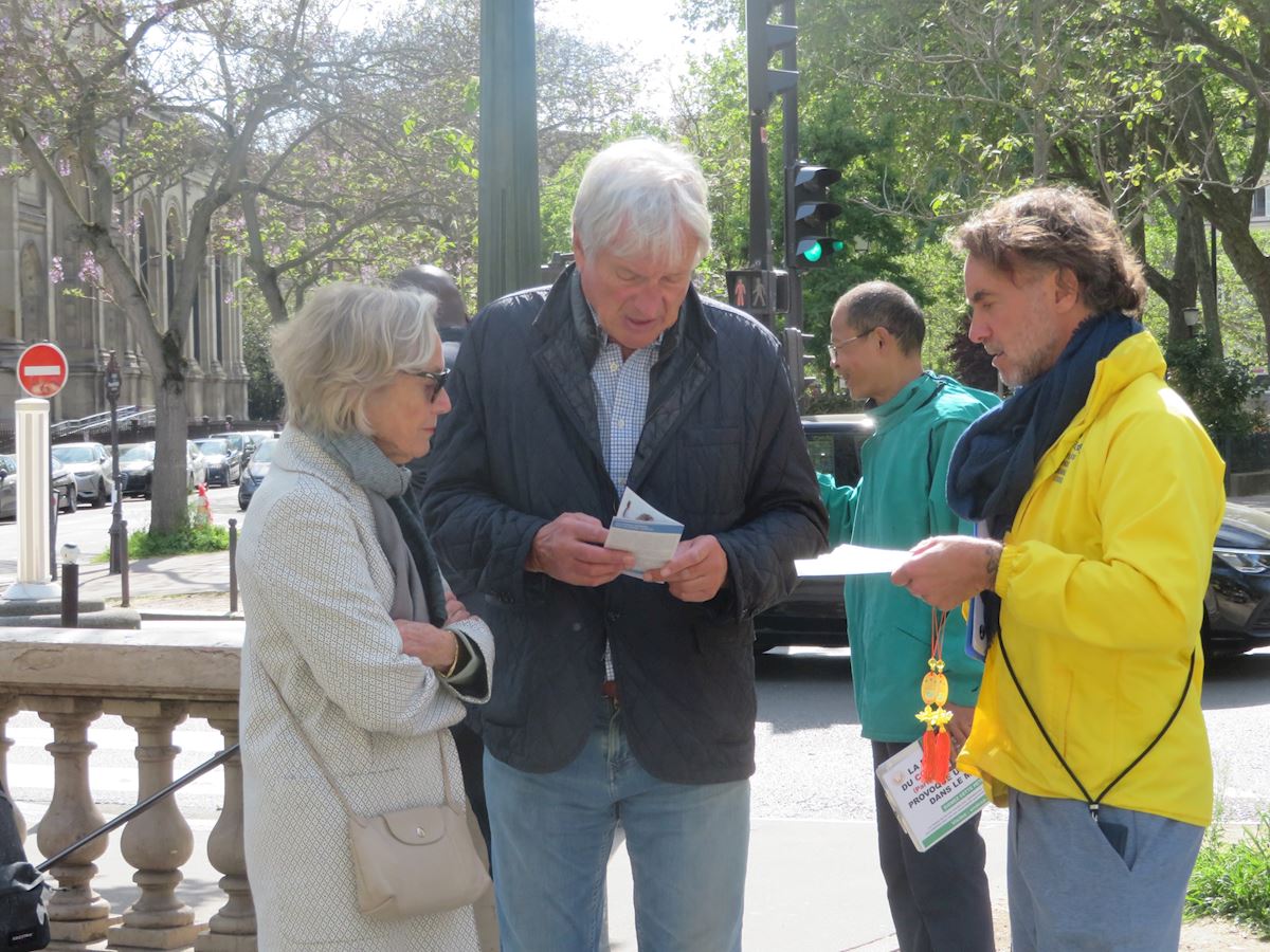 (Minghui.org) Le 20 avril 2026, les pratiquants ont organisé des activités sur la place André-Tardieu afin de commémorer l’Appel pacifique du 25 avril 1999 à Pékin. Les habitants du quartier et les touristes ont pu découvrir les bienfaits de la pratique du Falun Dafa et apprendre comment le Parti communiste chinois (PCC) continue de persécuter cette discipline spirituelle, notamment en prélevant des organes sur des pratiquants encore en vie.